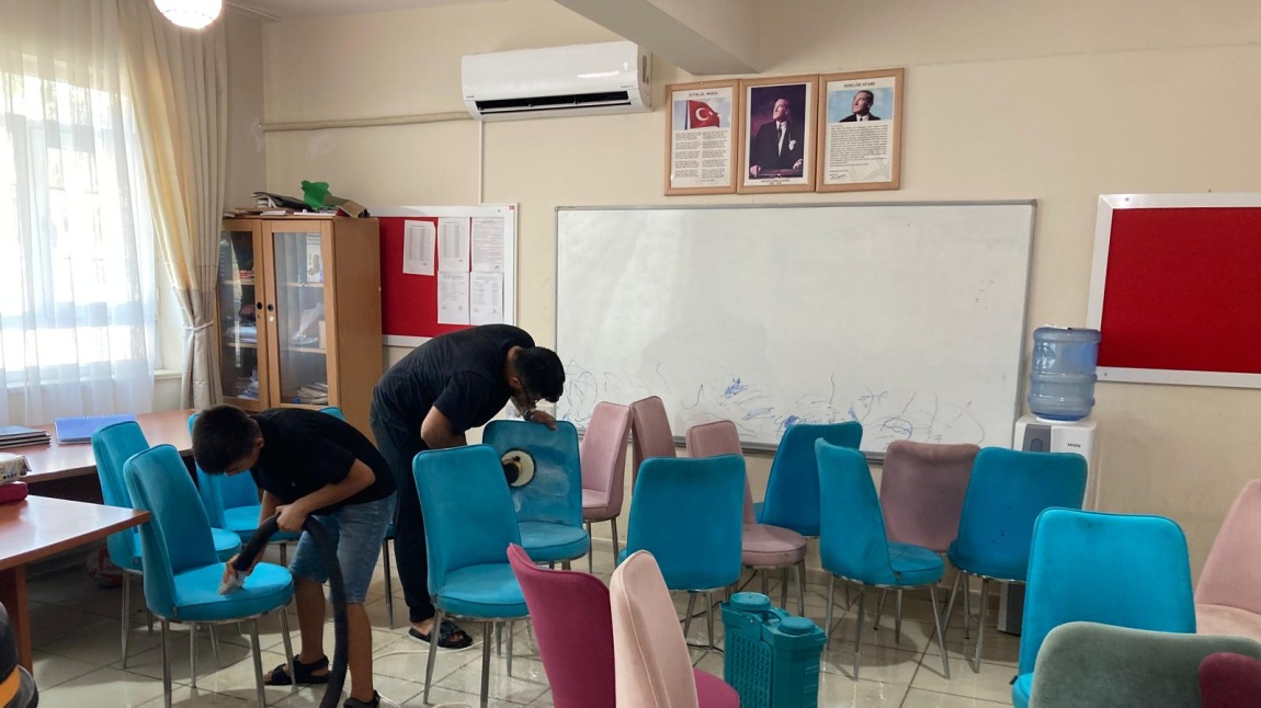 Öğretmenler odasında ve kütüphanede bulunan sandalyeler yıkanarak...